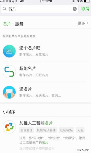 3:在搜索下拉框会出现多种可以创建微信小程序名片的小程序,这时候我们只需要选择第一个“名片”或者你喜欢的小程序即可创建属于自己的微信小程序名片。